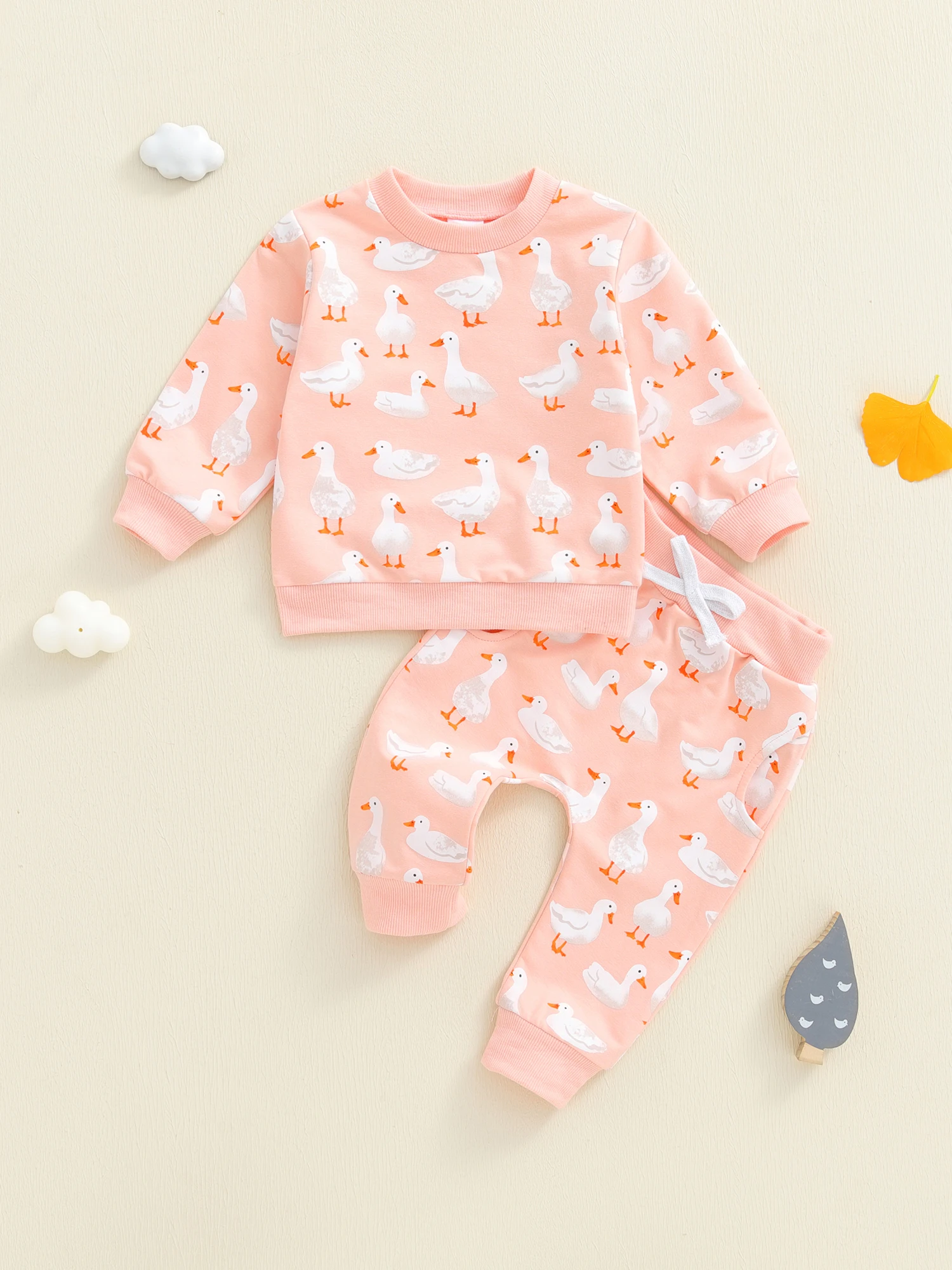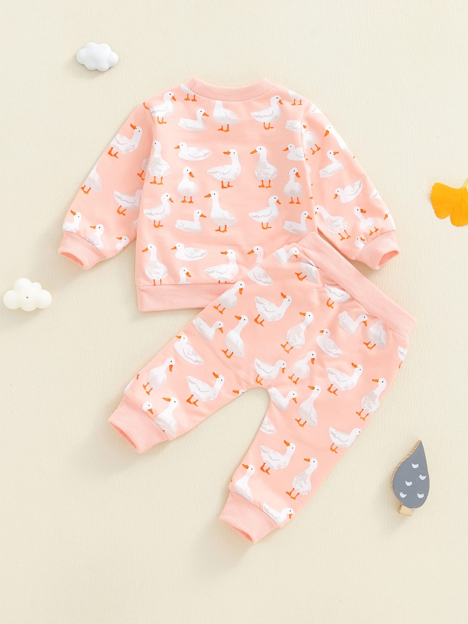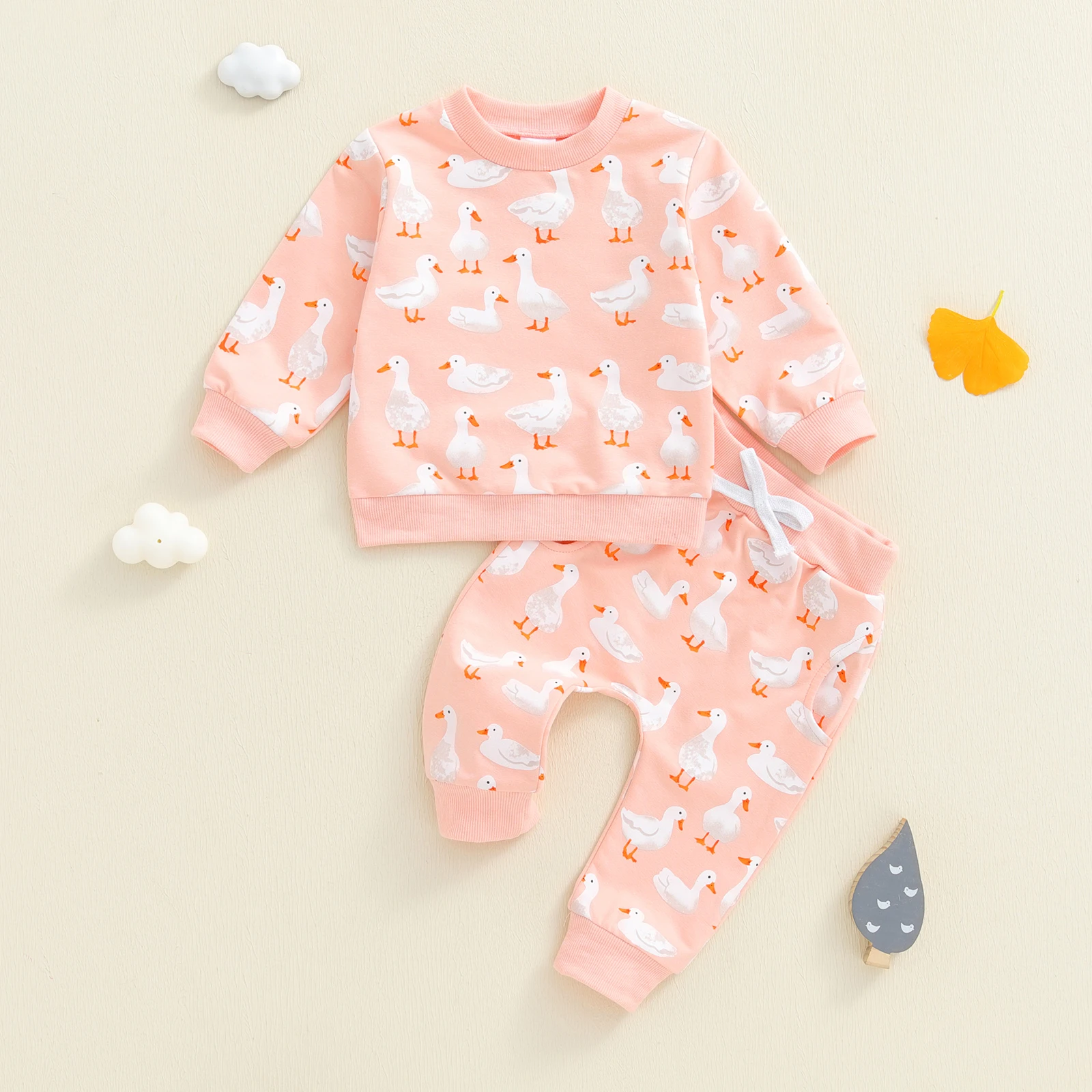 Baby Fall Outfits Goose Print Long Sleeve Round Neck Pullover + Elastic Waist Long Pants 2 Pcs Set
