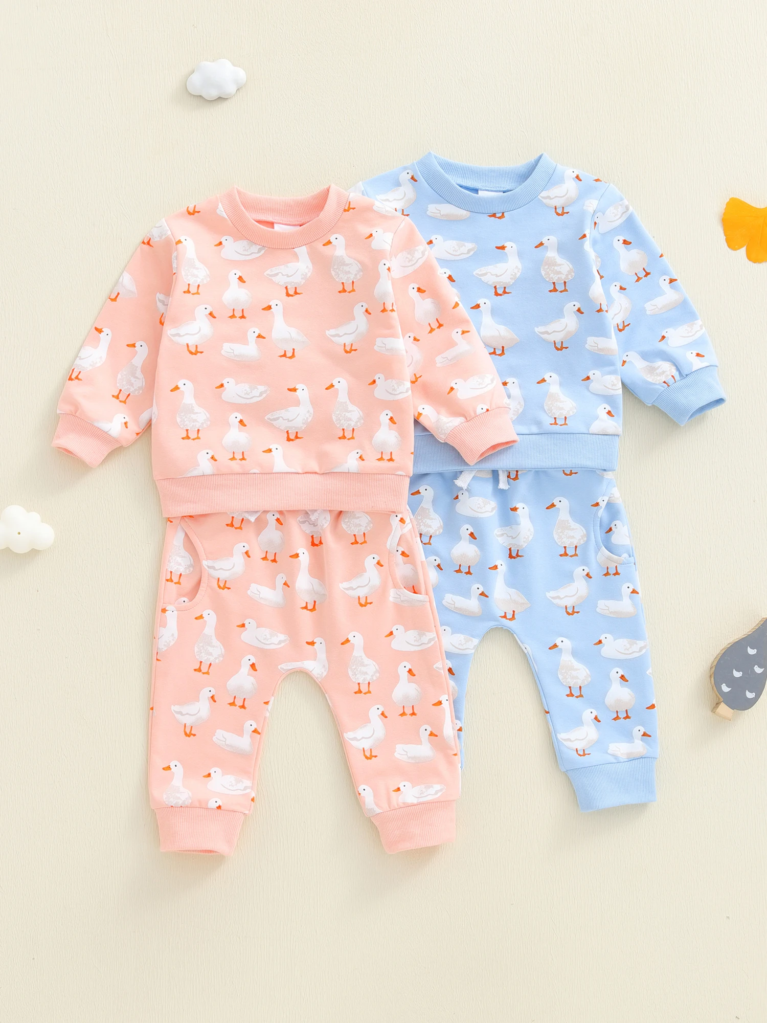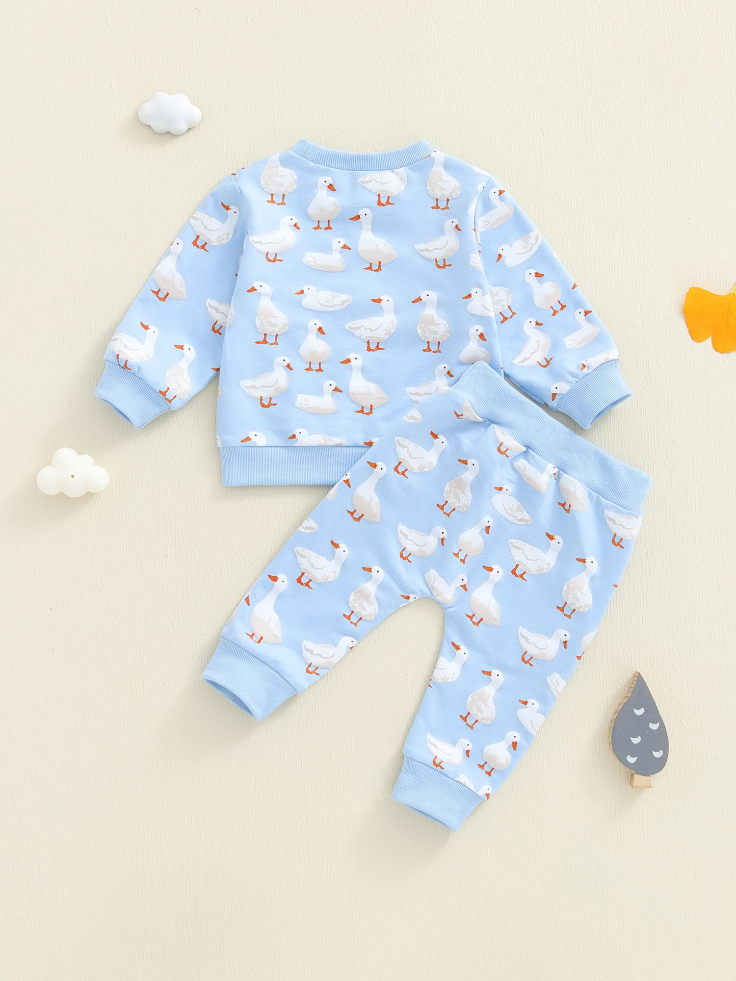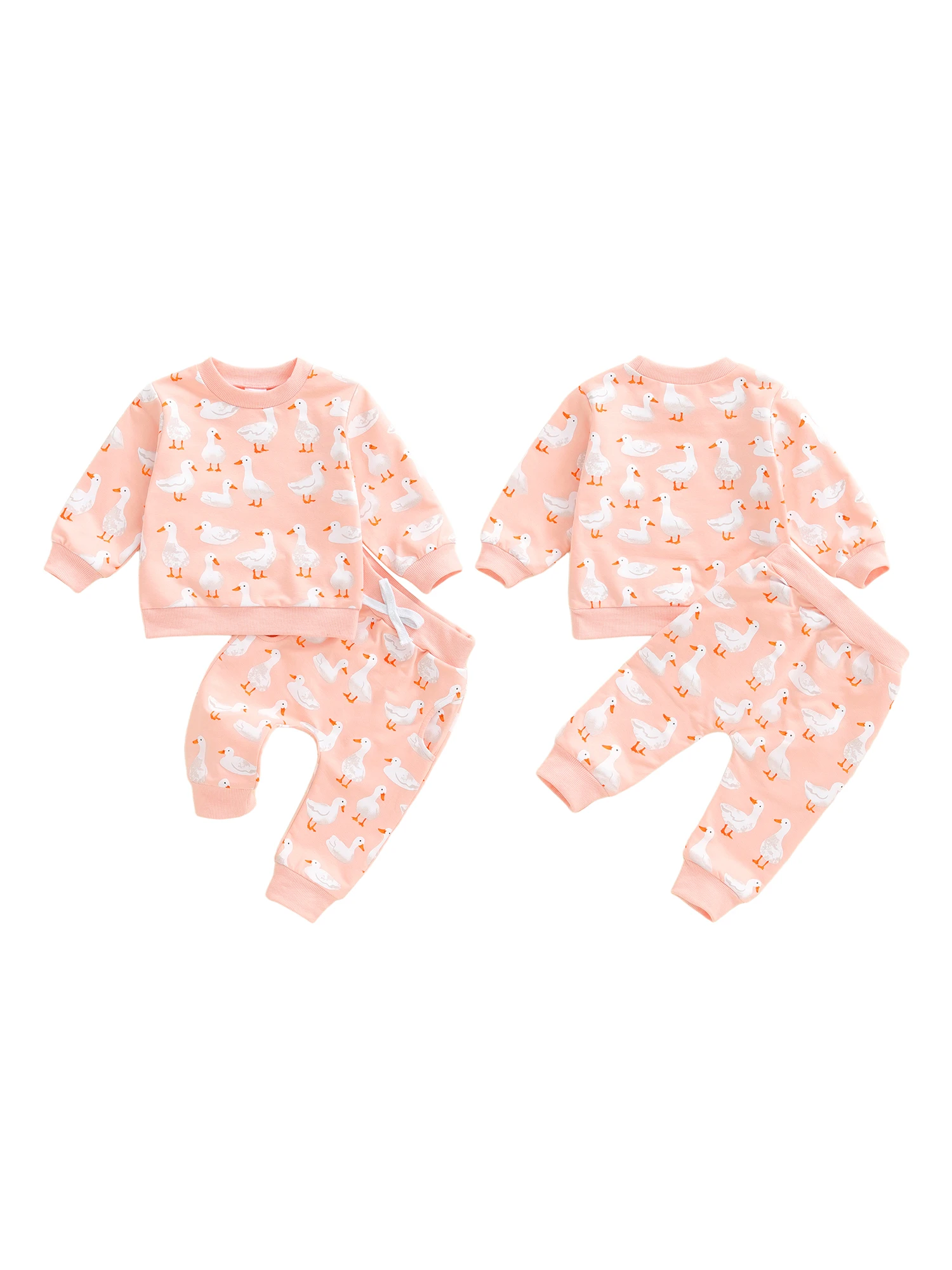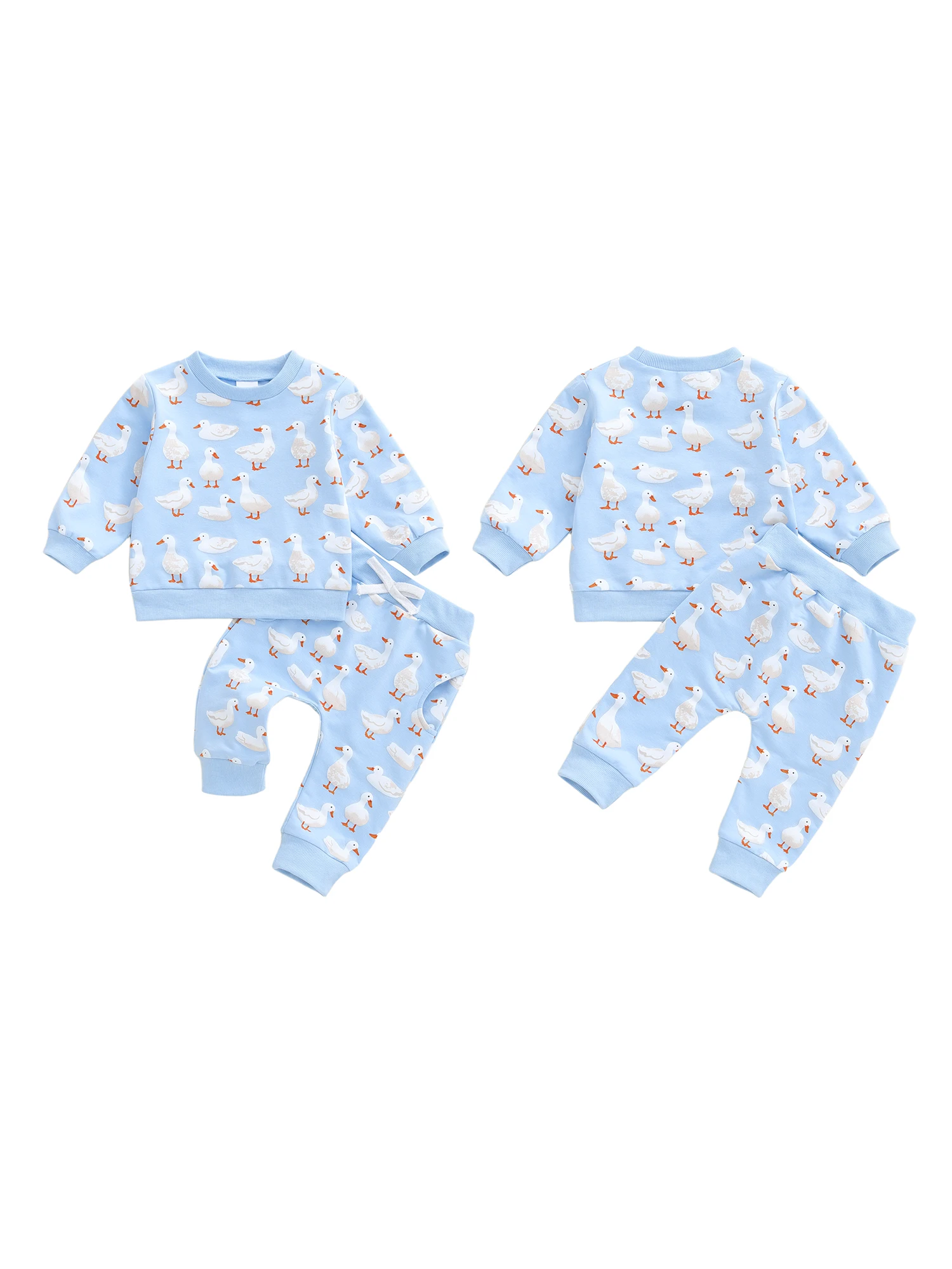 Baby Fall Outfits Goose Print Long Sleeve Round Neck Pullover + Elastic Waist Long Pants 2 Pcs Set
