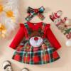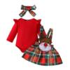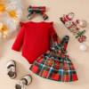 Infant Christmas Girl Solid Color Long Sleeved Triangle Romper With Embroidered Doll Plaid Suspenders Skirt Set