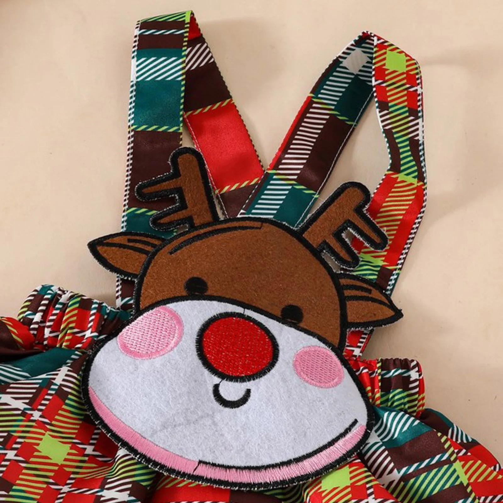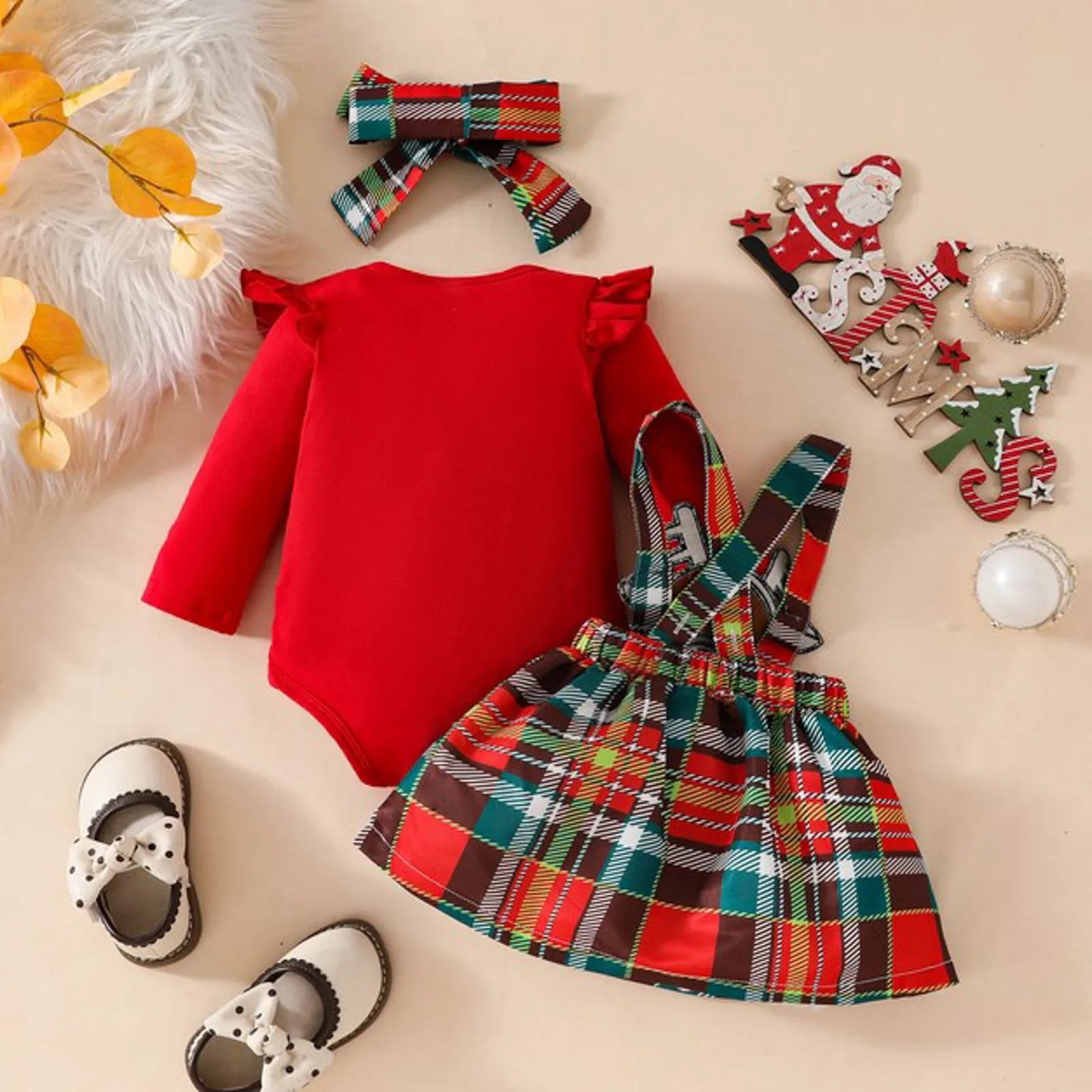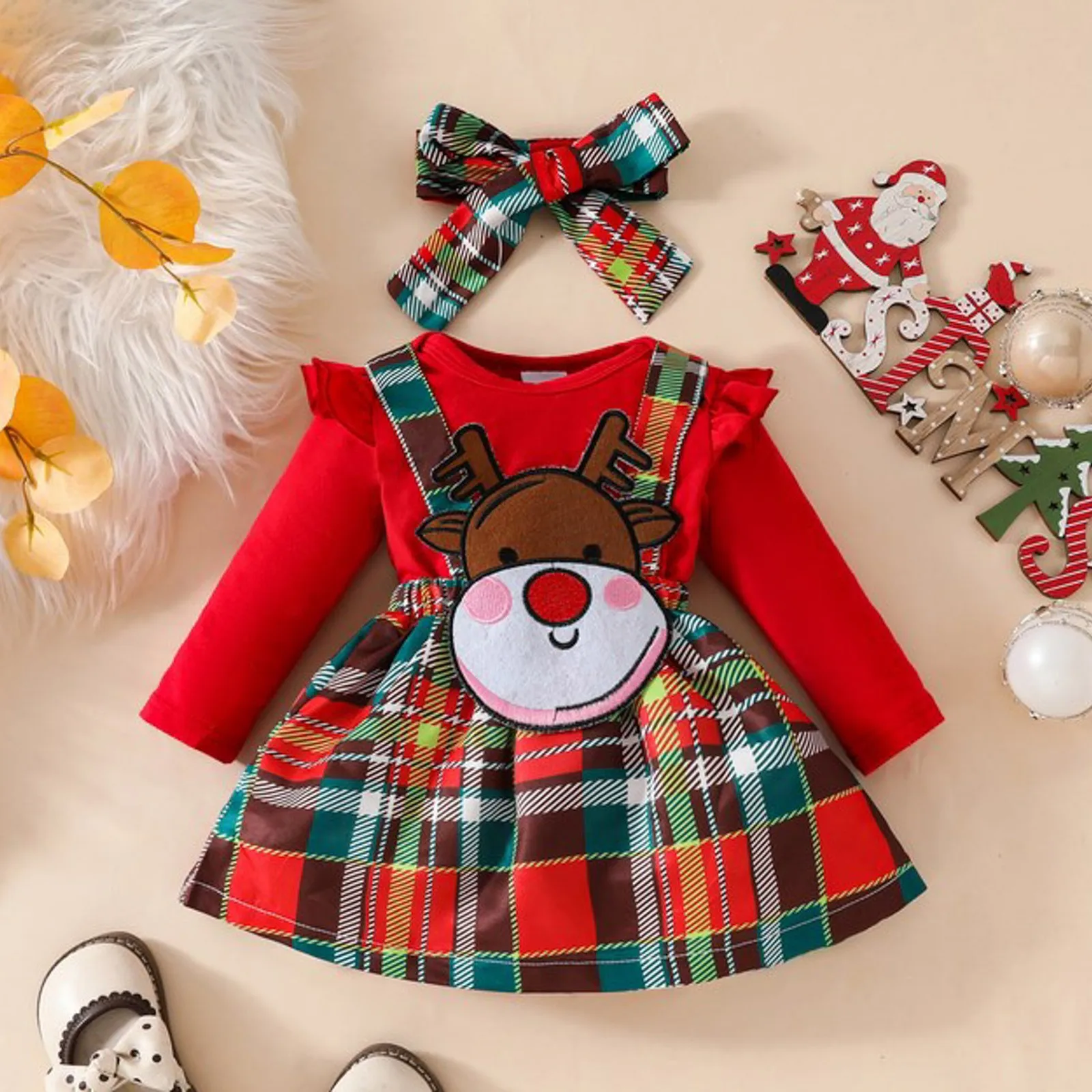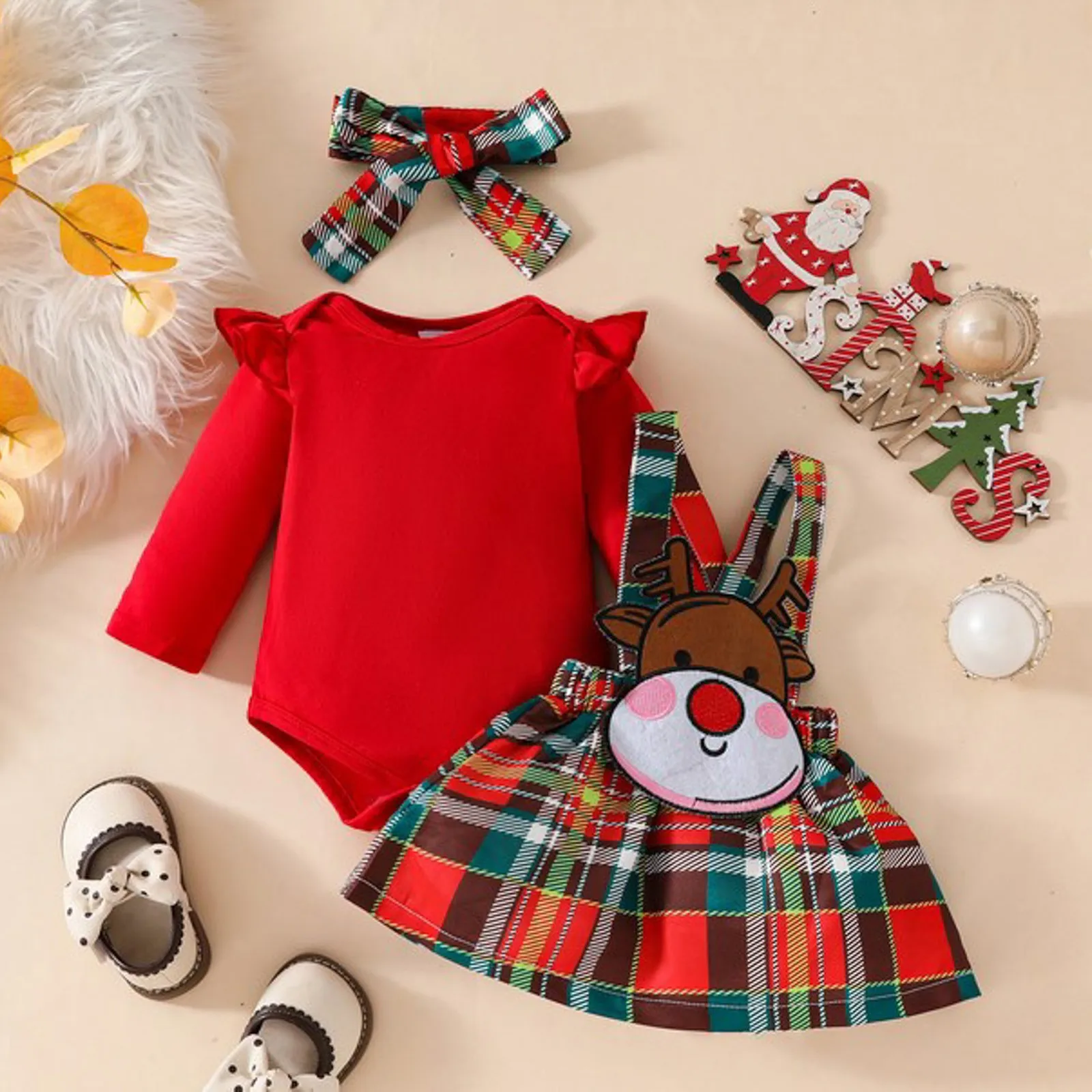 Christmas Design: Baby Girl My First Christmas Clothing Set with ruffle design, the skirt with pattern is the Christmas gift parents can give to their baby, round neck jumpsuit, with deer plaid print A-line suspender skirt, bow headband. Cute baby girl Christmas outfit, this outfit will definitely become a favorite in your little girl’s wardrobe.