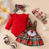 Infant Christmas Girl Solid Color Long Sleeved Triangle Romper With Embroidered Doll Plaid Suspenders Skirt Set