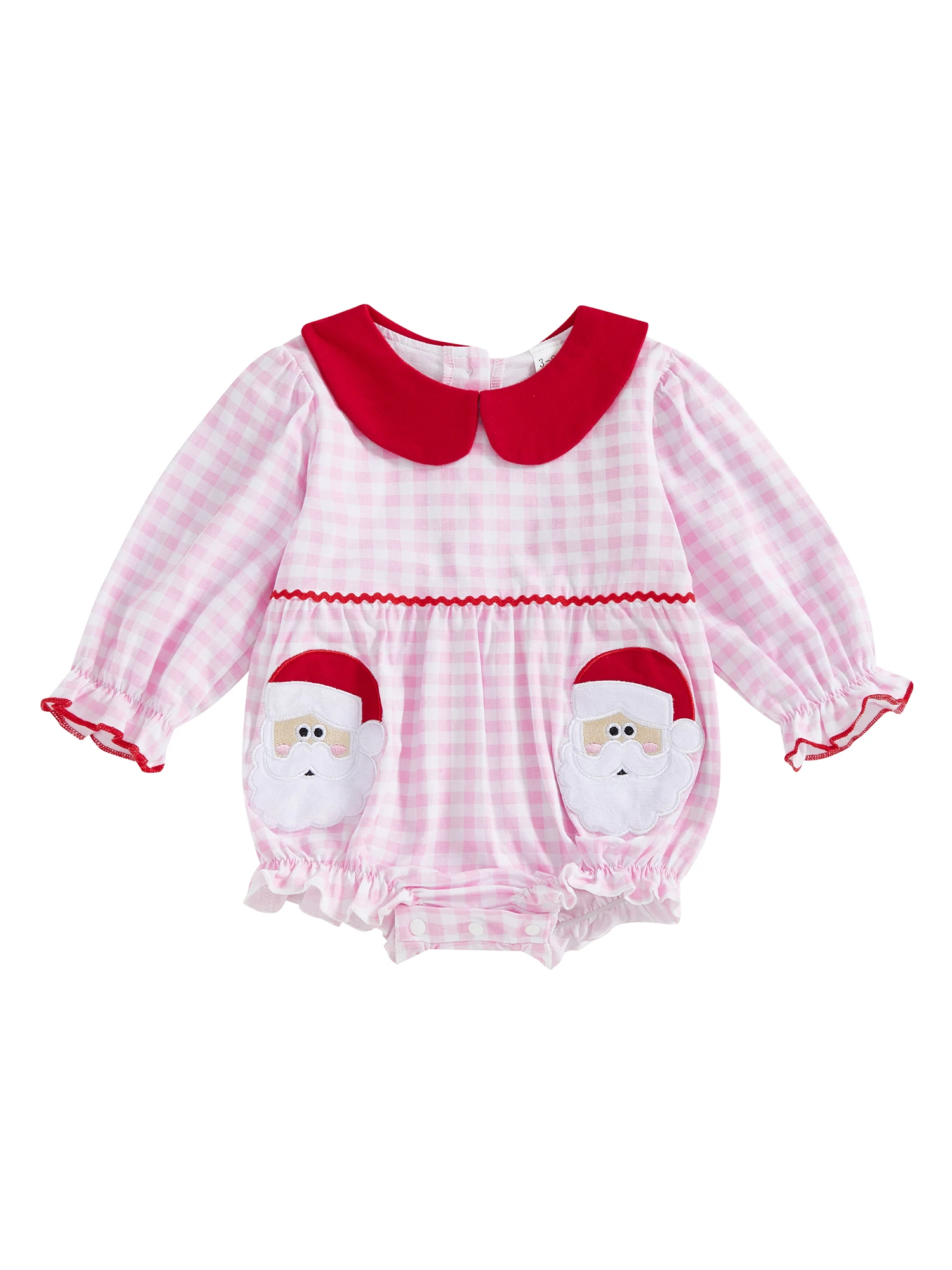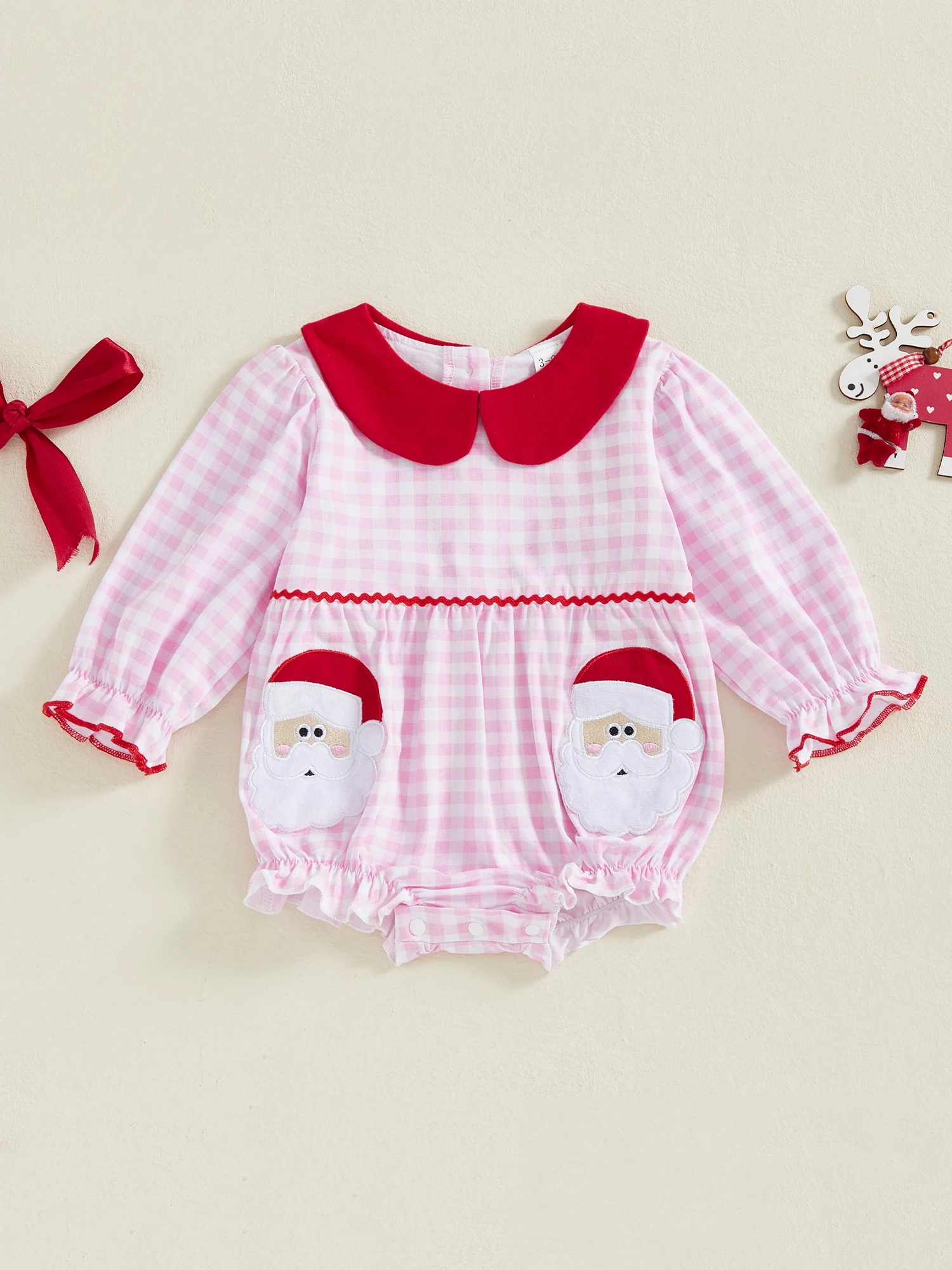 Baby Girl Christmas Plaid Romper Long Sleeve Doll Collar Santa Claus Embroidery Jumpsuit